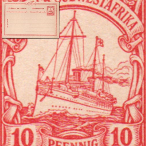 Kartka pocztowa z załączoną kartką na odpowiedź zwrotną, przeznaczona do użytku w niemieckiej Afryce Południowo-Zachodniej.