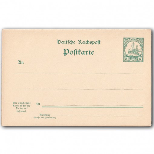 Kartka pocztowa z załączoną kartką na odpowiedź zwrotną, przeznaczona do użytku w niemieckiej Afryce Południowo-Zachodniej.