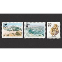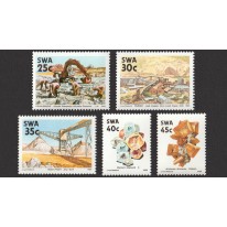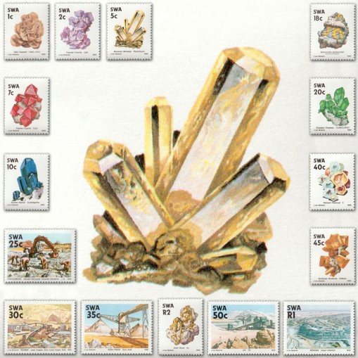 Na znaczkach przedstawiono minerały Afryki Południowo-Zachodniej i sceny ich wydobycia. Są to kolejno: gips, fluoryt, mimetezyt, kupryt, azuryt, boltwoodyt (ang. boltwoodite), dioptaz, kopalnia wydobycia diamentów Oranjemund, kopalnia ołowiu i miedzi Tsumeb, kopalnia cynku Rosh Pinah, diamenty, wulfenit, kopalnia cyny Uis, kopalnia uranu Rossing, złoto.