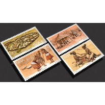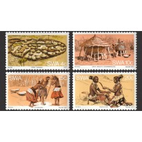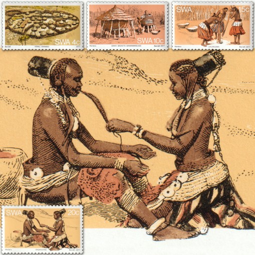 Na znaczkach widnieją aspekty życia i kultury ludu Owambo: