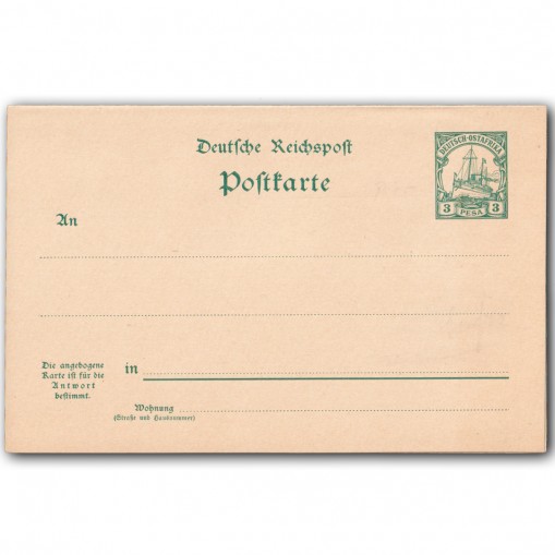 Kartka pocztowa z załączoną kartką na odpowiedź zwrotną, przeznaczona do użytku w niemieckiej Afryce Wschodniej.