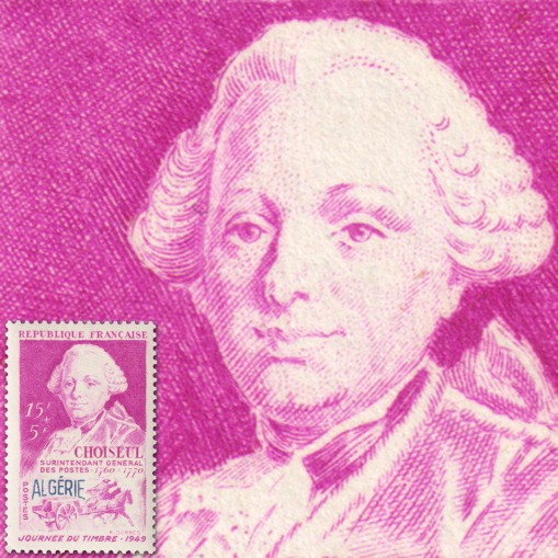 Na znaczku przedstawiono dyrektora naczelnego poczty francuskiej o nazwisku Choiseul oraz dyliżans pocztowy.