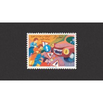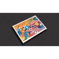 Znaczek promujący bezpieczeństwo dzieci na drogach. Widnieje na nim rysunek przedstawiający stylizowany na niebezpieczne zwierzę samochód i ludzi stających do walki z nim dzierżąc w rękach znaki drogowe.