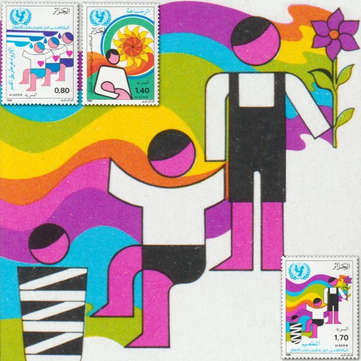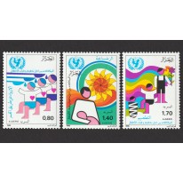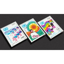 Znaczki promujące kampanię UNESCO na rzecz ochrony zdrowia dzieci. Na znaczkach przedstawiono podawanie szczepionki doustnej dzieciom, matkę z dzieckiem oraz trójkę dzieci w różnym wieku na tle tęczy.