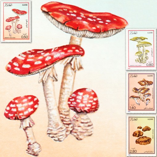 Na znaczkach przedstawiono grzyby, które występują w Algierii, a są to muchomor czerwony, muchomor sromotnikowy (muchomor zielonawy), boczniak mikołajkowy oraz trufla (łac. Terfezia leonis).