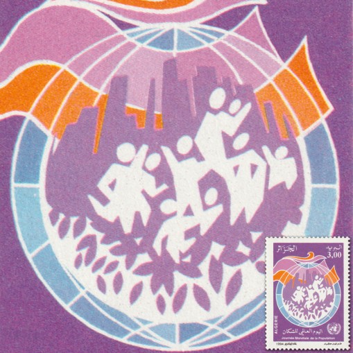 Znaczek upamiętniający Światowy Dzień Ludności, obchodzony 11. lipca. Przedstawiono na nim sylwetki ludzi w obrysie kuli ziemskiej.