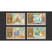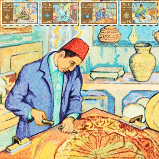 Na znaczkach widnieją rękodzielnicy algierscy przy pracy: koszykarka, przędzarka, miedziorytnik oraz jubiler.