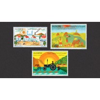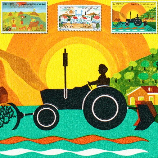 Na znaczkach widnieją rysunki dzieci algierskich przedstawiające wieś, pracę w polu i traktor.