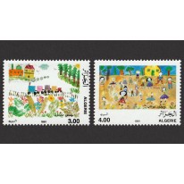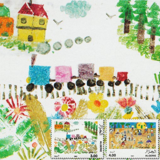 Na znaczkach widnieją rysunki dzieci przedstawiające wycieczkę pociągiem i zabawy dziecięce.
