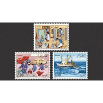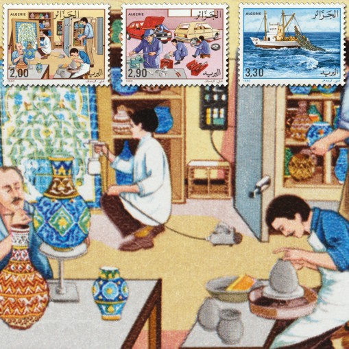 Na znaczku widnieją rękodzielnicy wytwarzający przedmioty ceramiczne, mechanicy samochodowi i rybacy.