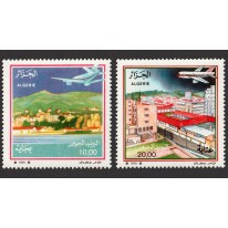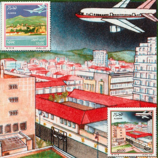 Znaczki lotnicze, na których przedstawiono samoloty ponad algierskimi miastami: Béjaïą i Annabą.