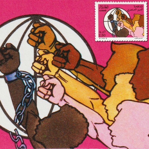 Na znaczku widnieją ludzie różnych ras z wzniesionymi pięściami na tle globu ziemskiego.
