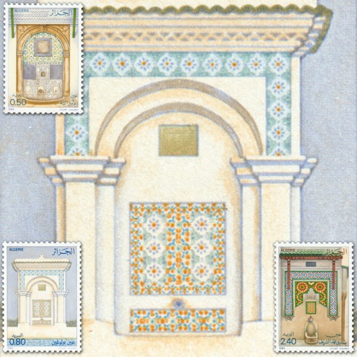 Na znaczkach przedstawiono pięknie zdobione mozaikami fontanny starego Algieru.
