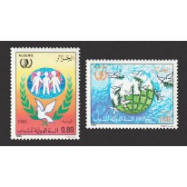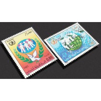 Znaczki upamiętniające Międzynarodowy Rok Młodzieży. Przedstawiono na nich ludzi na tle globu ziemskiego, gołębia pokoju i wieniec laurowy, oraz gołębie układające zielone gałązki w kształt kuli ziemskiej.