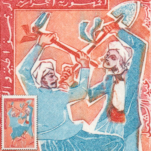 Znaczek upamiętniający Dzień Pracy. Na znaczku przedstawiono dwóch mężczyzn w tradycyjnych strojach, z narzędziami: łopatą i motyką.