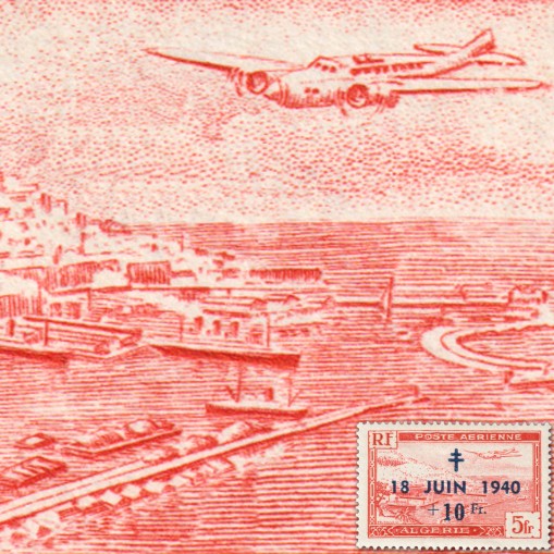 Znaczek wydano w 1946 roku. Przedstawia on samolot Potez 56 nad portem w Algierze, ale tym razem ma nadruk krzyża lotaryńskiego i datę "18 JUIN 1940" oraz przedruk "+ 10 Fr".
