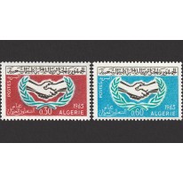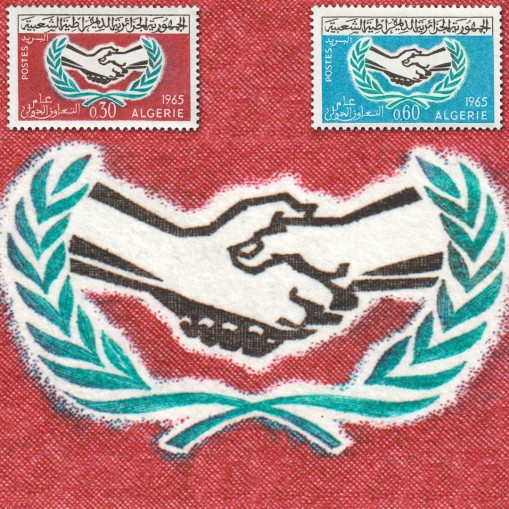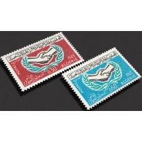 Znaczki upamiętniające Międzynarodowy Rok Współpracy. Na znaczkach przedstawiono uścisk dłoni otoczony wieńcem laurowym.