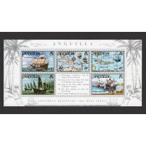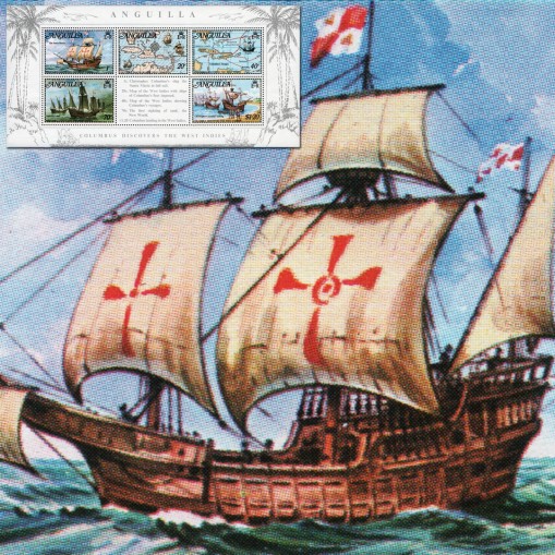 Znaczki w bloku upamiętniające odkrycie przez Krzysztofa Kolumba Indii Zachodnich, czyli wysp leżących między Morzem Karaibskim a Oceanem Atlantyckim (Wielkich Antyli, Małych Antyli oraz archipelagu Bahamów).