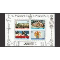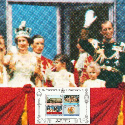 Na znaczkach widnieją kolejno: pałac Buckingham, ceremonia koronacyjna, rodzina królewska i herb Anglii.