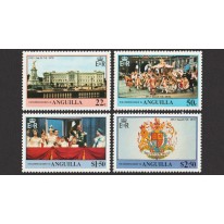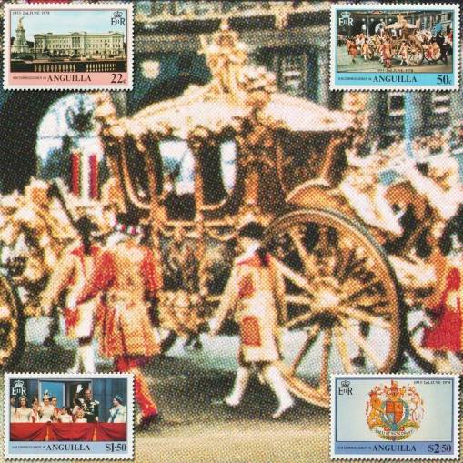 Na znaczkach widnieją kolejno: pałac Buckingham, ceremonia koronacyjna, rodzina królewska i herb Anglii.