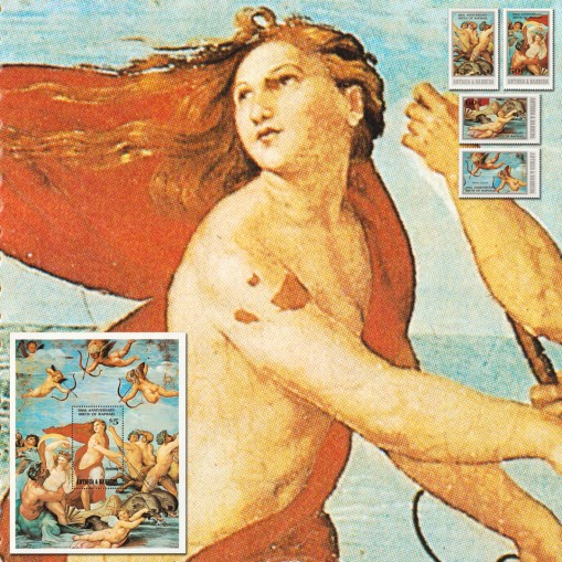 Na znaczkach widnieją fragmenty jego fresku „Triumf Galatei” (1512) namalowanego na zlecenie bogatego bankiera z Sieny, Agostina Chigi, w jego rezydencji u podnóża Rzymu. Temat przewodni obrazu został zaczerpnięty z mitologii greckiej, z XIII księgi Metamorfoz Owidiusza. Galatea była nimfą morską zakochaną w pasterzu o imieniu Akis. W niej zakochany był cyklop Polifem. Tragiczny układ miłosny doprowadził do śmierci pasterza z ręki zazdrosnego cyklopa.