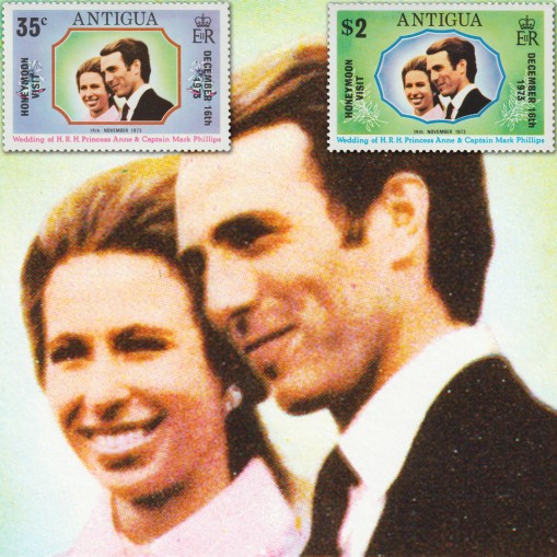 Znaczki wydane wcześniej tego samego roku z okazji ślubu księżniczki Anny (córki królowej Elżbiety II) i Marka Phillipsa, tym razem z nadrukami upamiętniającymi podróż poślubną młodej pary.
