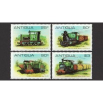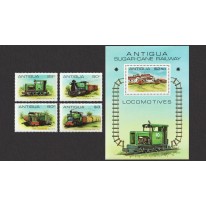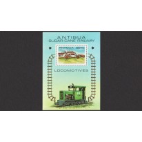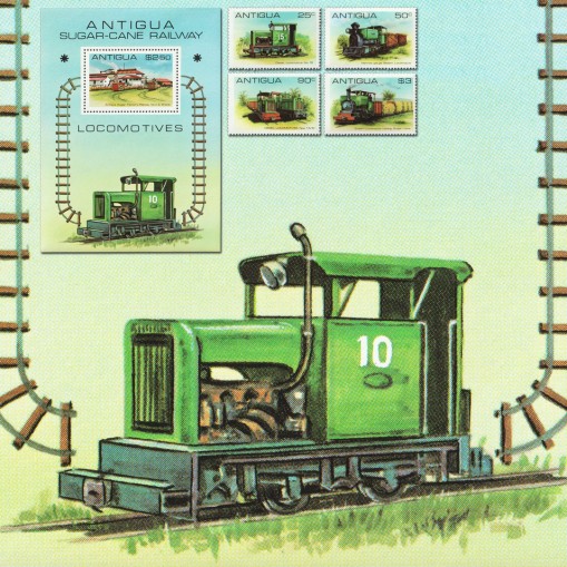 Znaczki i blok upamiętniające linię kolejową transportującą trzcinę cukrową na Antigui.