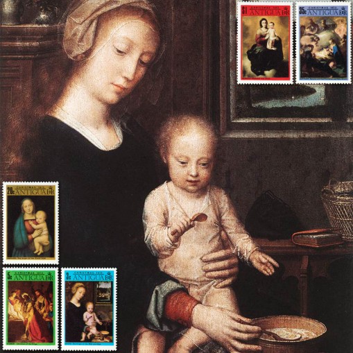 Na znaczkach widnieją reprodukcje dzieł malarstwa epoki renesansu, m.in. „Maria karmiąca Dzieciątko papką mleczną” Gerarda Davida z około 1515 roku czy „Madonna di Granduca” Rafaela.
