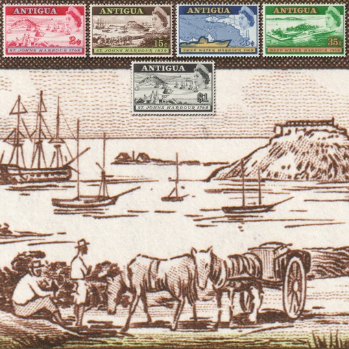 Znaczki upamiętniające otwarcie portu głębokowodnego w Saint John’s na Antigui.