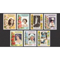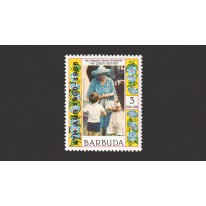 Znaczki upamiętniające 85. urodziny brytyjskiej królowej matki Elżbiety z okolicznościowym nadrukiem z datą jej urodzin „4TH AUG 1900-1985”.
