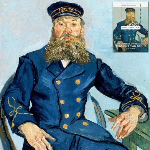 Blok upamiętniający 125. rocznicę śmierci Vincenta van Gogha. Widnieje na nim reprodukcja obrazu malarza pod tytułem „Listonosz Joseph Roulin” z 1888 roku.