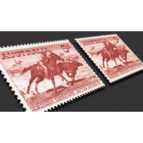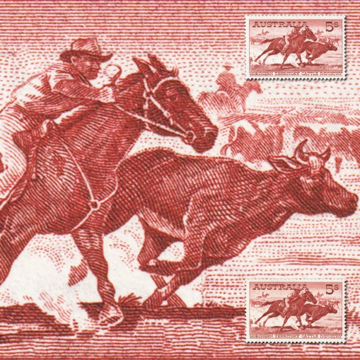 Na znaczku przedstawiono aborygeńskiego kowboja, doglądającego stado krów.