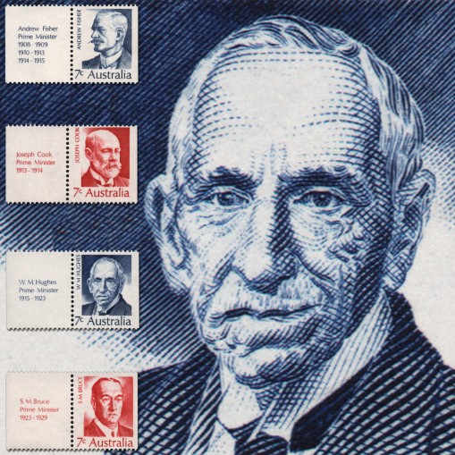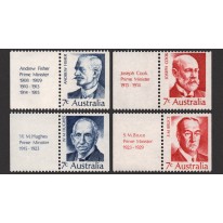 Na znaczkach widnieją pierwsi premierzy Australii, kolejno: