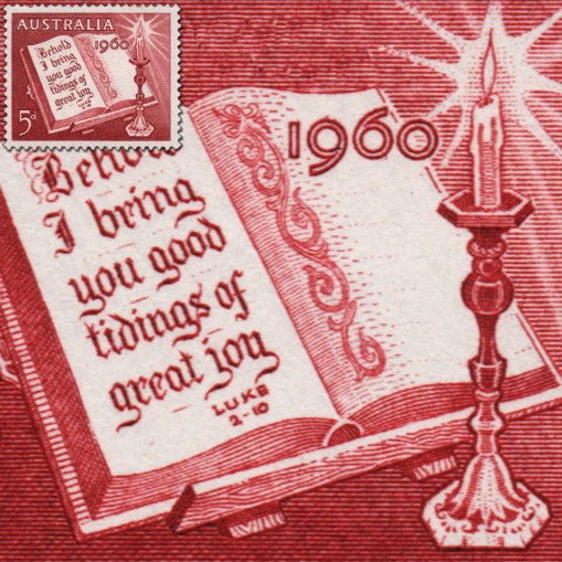 Na znaczku widnieje biblia otwarta na ewangelii świętego Łukasza i świeca.