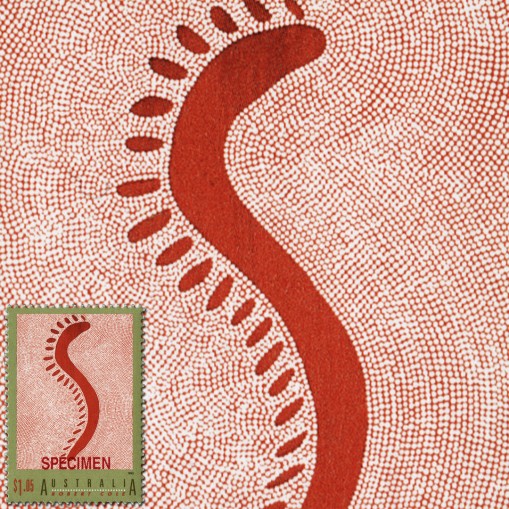 Wzór znaczka z serii upamiętniającej międzynarodowy rok ludności rdzennej i przedstawiającej malarstwo Aborygenów. Walor posiada nadruk „specimen” (wzór).