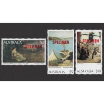 Wzory trzech znaczków, na których przedstawiono malarstwo australijskie. Walory posiadają nadruki „specimen” (wzór).