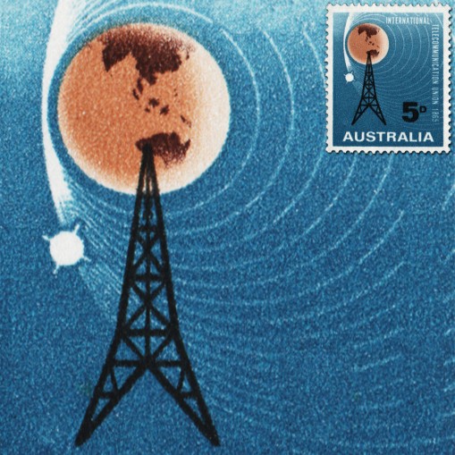 Na znaczku widnieje maszt telekomunikacyjny, satelita i kula ziemska.