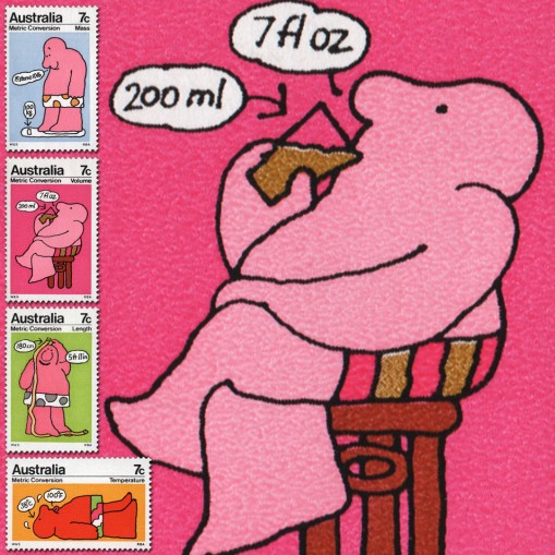 Znaczki upamiętniające wprowadzenie w Australii Międzynarodowego Systemu Jednostek Miar opartego o system metryczny.