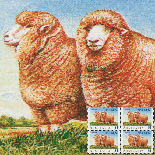 Wzór znaczka w czwórce z serii przedstawiającej różne rasy owiec. Walor posiada nadruk „specimen” (wzór). Na znaczku widnieje rasa koriedele (ang. Corriedale).