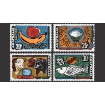 Znaczki prezentujące produkty australijskiego przemysłu spożywczego: owoce, ryż, ryby i wołowinę.