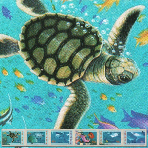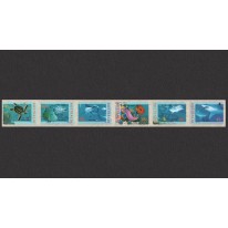 Samoprzylepne znaczki w pasku (wydawane w rolkach), na których widnieją gatunki zwierząt występujące w wodach u wybrzeży Australii, kolejno:
