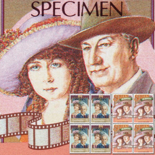Wzory dwóch znaczków w czwórkach z serii przedstawiającej słynnych aktorów teatralnych i filmowych. Walory posiadają nadruki „specimen” (wzór).