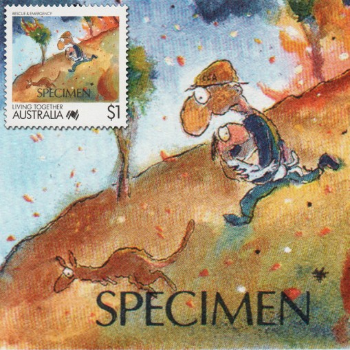 Na znaczku widnieje strażak ratujący z pożaru lasu.