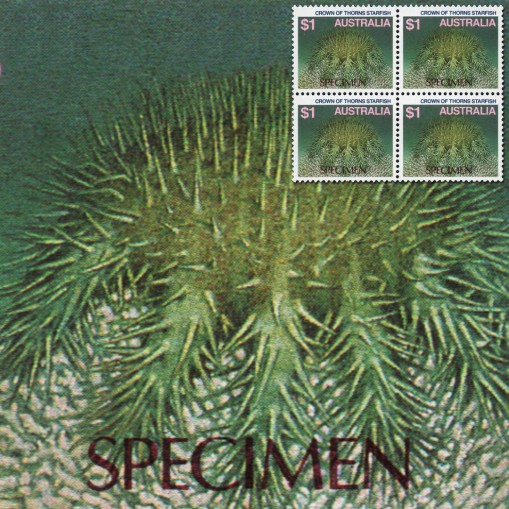 Na znaczku widnieje korona cierniowa (Acanthaster planci), gatunek drapieżnego szkarłupnia z gromady rozgwiazd występującego pospolicie na rafach koralowych Morza Czerwonego, Oceanu Indyjskiego i Spokojnego.