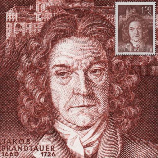 Znaczek upamiętniający setną rocznicę urodzin Jakoba Prandtauera, austriackiego architekta epoki baroku.