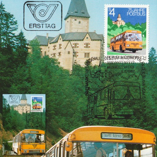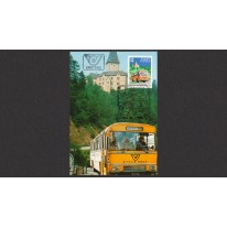 Znaczek na karcie maksimum upamiętniający 75-lecie istnienia sieci masowego transportu autobusowego zorganizowana przez austriacką pocztę (POSTAUTO).