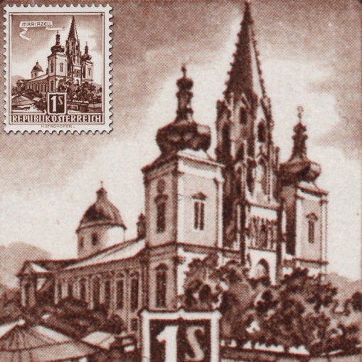 Znaczek obiegowy sprzedawany w automatach, na którym widnieje bazylika w Mariazell.