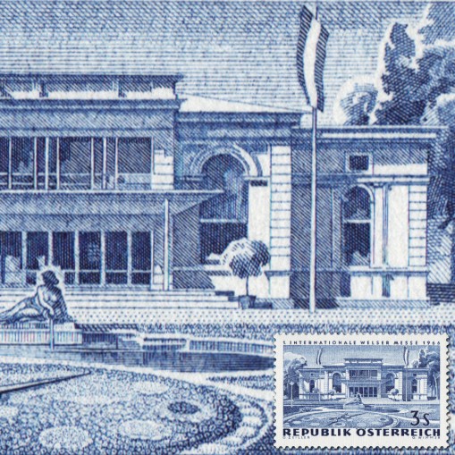 Znaczek upamiętniający pierwsze targi międzynarodowe w Wels.