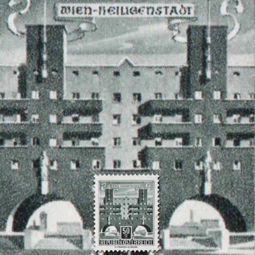 Znaczek obiegowy sprzedawany w automatach, na którym widnieją budynki mieszkalne „Karl-Max-Hof” we wiedeńskiej dzielnicy Heiligenstadt, jeden z wiedeńskich projektów komunalnego budownictwa mieszkaniowego realizowanych w latach 1918–1934.