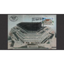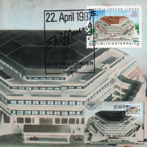 Znaczek na karcie maksimum upamiętniający otwarcie wiedeńskiego centrum konferencyjnego Austria Center Vienna.